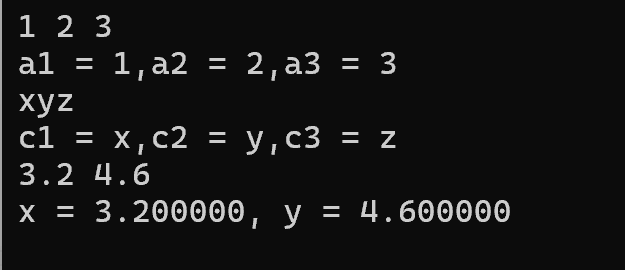 #include <stdio.h> int main() { double x, y; char c1, c2, c3; int a1, a2, a3; scanf("%d%d%d",&a1, &a2, &a3); //缺少了符号 “& ” printf("a1 = %d,a2 = %d,a3 = %d\n",a1,a2,a3); scanf(" %c%c%c",&c1,&c2,&c3); printf("c1 = %c,c2 = %c,c3 = %c\n",c1,c2,c3); scanf("%lf%lf",&x, &y); // 应该使用%lf printf("x = %lf, y = %lf\n",x,y); return 0; }