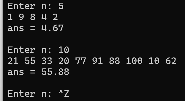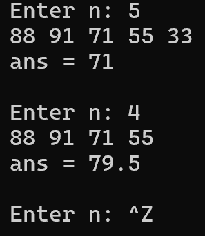 #include <stdio.h> #define N 100 void input(int x[],int n); double compute(int x[],int n); int main() { int x[N]; int n,i; double ans; while (printf("Enter n: "),scanf("%d",&n) != EOF) { input(x,n); ans = compute(x,n); printf("ans = %.2f\n\n",ans); } return 0; } void input(int x[],int n) { int i; for(i=0;i<n;++i) scanf("%d",&x[i]); } double compute(int x[],int n) { int i,high,low; double ans; high = low = x[0]; ans = 0; for(i=0;i<n;++i) { ans+=x[i]; if(x[i]>high) high = x[i]; if(x[i]<low) low = x[i]; } ans = (ans-high-low)/(n-2); return ans; }