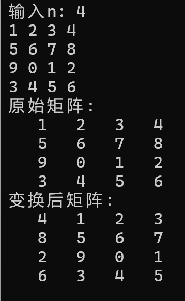 #include <stdio.h> #define N 100 // 函数声明 void input(int x[][N], int n); void output(int x[][N], int n); // 函数rotate_to_right声明 void rotate_to_right(int x[][N],int n); int main() { int x[N][N]; int n; printf("输入n: "); scanf("%d", &n); input(x, n); printf("原始矩阵:\n"); output(x, n); // 函数rotate_to_right调用 rotate_to_right(x,n); printf("变换后矩阵:\n"); output(x, n); return 0; } // 函数定义 // 功能: 输入一个n*n的矩阵x void input(int x[][N], int n) { int i, j; for (i = 0; i < n; ++i) { for (j = 0; j < n; ++j) scanf("%d", &x[i][j]); } } // 函数定义 // 功能: 输出一个n*n的矩阵x void output(int x[][N], int n) { int i, j; for (i = 0; i < n; ++i) { for (j = 0; j < n; ++j) printf("%4d", x[i][j]); printf("\n"); } } // 函数rotate_to_right定义 // 功能: 把一个n*n的矩阵x,每一列向右移, 最右边被移出去的一列绕回左边 void rotate_to_right(int x[][N],int n) { int i,j; int t[N]; for(i=0;i<n;++i) t[i]=x[i][n-1]; for (i = n-1; i > 0; --i) for (j = 0; j < n; ++j) x[j][i] = x[j][i-1]; for(i=0;i<n;++i) x[i][0]=t[i]; }