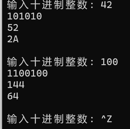 #include <stdio.h> #include <stdlib.h> #define N 100 void dec_to_n(int x, int n); // 函数声明 int main() { int x; while(printf("输入十进制整数: "), scanf("%d", &x) != EOF) { dec_to_n(x, 2); // 函数调用: 把x转换成二进制输出 dec_to_n(x, 8); // 函数调用: 把x转换成八进制输出 dec_to_n(x, 16); // 函数调用: 把x转换成十六进制输出 printf("\n"); } return 0; } // 函数定义 //功能: 把十进制数x转换成n进制,打印输出 void dec_to_n(int x, int n) { char map[]= "0123456789ABCDEF"; int cnt=0,d,r; char ans[N]; do { r = x%n; x = x/n; ans[cnt] = map[r]; cnt++; }while(x!=0); for(--cnt;cnt>=0;cnt--) printf("%c",ans[cnt]); printf("\n"); }