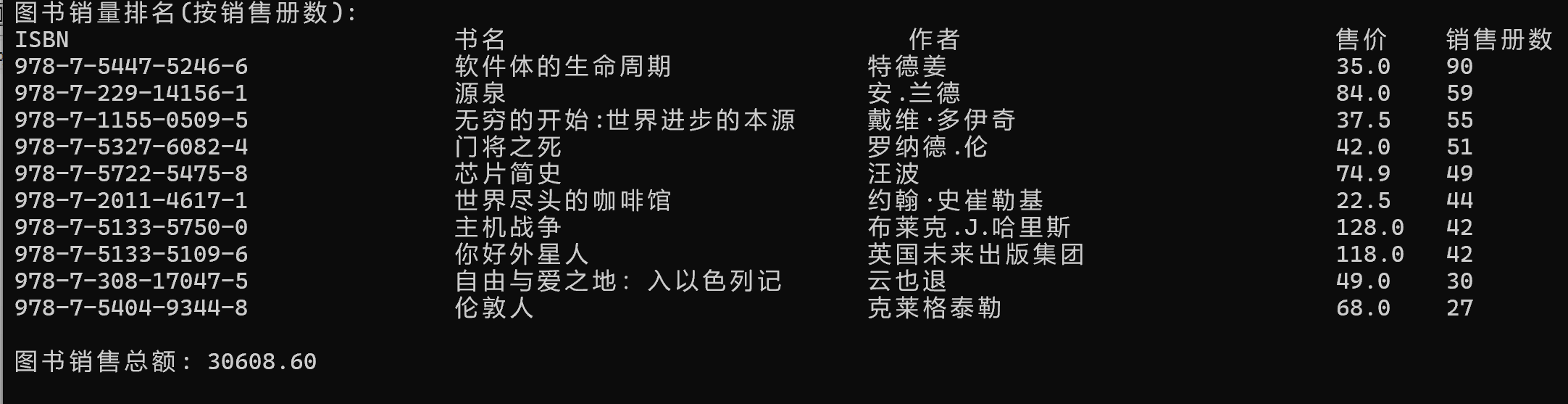 #include <stdio.h> #define N 10 typedef struct { char isbn[20]; // isbn号 char name[80]; // 书名 char author[80]; // 作者 double sales_price; // 售价 int sales_count; // 销售册数 } Book; void output(Book x[], int n); void sort(Book x[], int n); double sales_amount(Book x[], int n); int main() { Book x[N] = {{"978-7-5327-6082-4", "门将之死", "罗纳德.伦", 42, 51}, {"978-7-308-17047-5", "自由与爱之地:入以色列记", "云也退", 49 , 30}, {"978-7-5404-9344-8", "伦敦人", "克莱格泰勒", 68, 27}, {"978-7-5447-5246-6", "软件体的生命周期", "特德姜", 35, 90}, {"978-7-5722-5475-8", "芯片简史", "汪波", 74.9, 49}, {"978-7-5133-5750-0", "主机战争", "布莱克.J.哈里斯", 128, 42}, {"978-7-2011-4617-1", "世界尽头的咖啡馆", "约翰·史崔勒基", 22.5, 44}, {"978-7-5133-5109-6", "你好外星人", "英国未来出版集团", 118, 42}, {"978-7-1155-0509-5", "无穷的开始:世界进步的本源", "戴维·多伊奇", 37.5, 55}, {"978-7-229-14156-1", "源泉", "安.兰德", 84, 59}}; printf("图书销量排名(按销售册数): \n"); sort(x, N); output(x, N); printf("\n图书销售总额: %.2f\n", sales_amount(x, N)); return 0; } void sort(Book x[], int n) { int i,j; Book t; for(i=0;i<n;++i) for(j=0;j<n-1-i;++j) if(x[j].sales_count<x[j+1].sales_count) { t=x[j]; x[j]=x[j+1]; x[j+1]=t; } } void output(Book x[], int n) { int i; printf("ISBN 书名 作者 售价 销售册数\n"); for(i=0;i<n;++i) printf("%-30s\t%-30s%-30s\t%.1lf\t%d\n",x[i].isbn,x[i].name,x[i].author,x[i].sales_price,x[i].sales_count); } double sales_amount(Book x[], int n) { int i; double total=0; for(i=0;i<n;++i) total += (double)x[i].sales_count*x[i].sales_price; return total; }