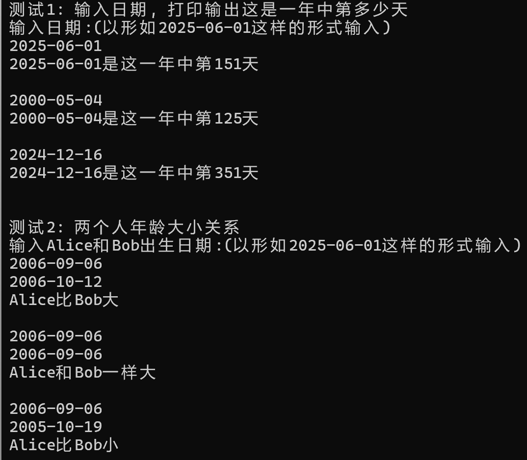 #include <stdio.h> typedef struct { int year; int month; int day; } Date; // 函数声明 void input(Date *pd); // 输入日期给pd指向的Date变量 int day_of_year(Date d); // 返回日期d是这一年的第多少天 int compare_dates(Date d1, Date d2); // 比较两个日期: // 如果d1在d2之前,返回-1; // 如果d1在d2之后,返回1 // 如果d1和d2相同,返回0 void test1() { Date d; int i; printf("输入日期:(以形如2025-06-01这样的形式输入)\n"); for(i = 0; i < 3; ++i) { input(&d); printf("%d-%02d-%02d是这一年中第%d天\n\n", d.year, d.month, d.day, day_of_year(d)); } } void test2() { Date Alice_birth, Bob_birth; int i; int ans; printf("输入Alice和Bob出生日期:(以形如2025-06-01这样的形式输入)\n"); for(i = 0; i < 3; ++i) { input(&Alice_birth); input(&Bob_birth); ans = compare_dates(Alice_birth, Bob_birth); if(ans == 0) printf("Alice和Bob一样大\n\n"); else if(ans == -1) printf("Alice比Bob大\n\n"); else printf("Alice比Bob小\n\n"); } } int main() { printf("测试1: 输入日期, 打印输出这是一年中第多少天\n"); test1(); printf("\n测试2: 两个人年龄大小关系\n"); test2(); } // 输入日期给pd指向的Date变量 void input(Date *pd) { scanf("%d-%d-%d",&pd->year,&pd->month,&pd->day); } // 返回日期d是这一年的第多少天 int day_of_year(Date d) { int i; int iday=0; int x[12] = {31,28,31,30,31,30,31,31,30,31,30,31}; //查询所得的方法 >_< if(d.month==1) return d.day; else { if(d.year%4==0 && d.year%100!=0||d.year%400==0) x[1]=29; for(i=1;i<d.month;++i) iday += x[i]; return iday+d.day; } } // 比较两个日期: // 如果d1在d2之前,返回-1; // 如果d1在d2之后,返回1 // 如果d1和d2相同,返回0 int compare_dates(Date d1, Date d2) { if(d1.year<d2.year) return -1; else if(d1.year>d2.year) return 1; else if(d1.year==d2.year) { if(d1.month<d2.month) return -1; else if(d1.month>d2.month) return 1; else if(d1.month==d2.month) { if(d1.day<d2.day) return -1; else if(d1.day>d2.day) return 1; else if(d1.day==d2.day) return 0; } } }