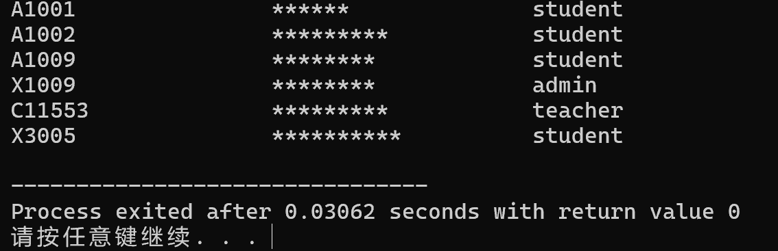 #include <stdio.h> #include <string.h> enum Role {admin, student, teacher}; typedef struct { char username[20]; // 用户名 char password[20]; // 密码 enum Role type; // 账户类型 //枚举类型 --- enum !!!! } Account; // 函数声明 void output(Account x[], int n); // 输出账户数组x中n个账户信息,其中,密码用*替代显示 int main() { Account x[] = {{"A1001", "123456", student}, {"A1002", "123abcdef", student}, {"A1009", "xyz12121", student}, {"X1009", "9213071x", admin}, {"C11553", "129dfg32k", teacher}, {"X3005", "921kfmg917", student}}; int n; n = sizeof(x)/sizeof(Account); output(x, n); return 0; } // 待补足的函数output()实现 // 功能:遍历输出账户数组x中n个账户信息 // 显示时,密码字段以与原密码相同字段长度的*替代显示 void output(Account x[], int n) { int i,j; for(j=0;j<n;j++) { for(i=0;x[j].password[i] != '\0';i++) x[j].password[i]='*'; x[j].password[++i]='\0'; //末尾加结束标志 \0 printf("%-20s%-20s",x[j].username,x[j].password); enum type {student,admin,teacher}; switch(x[j].type) { case 1: printf("student\n");break; case 0: printf("admin\n");break; case 2: printf("teacher\n");break; default:break; } } }