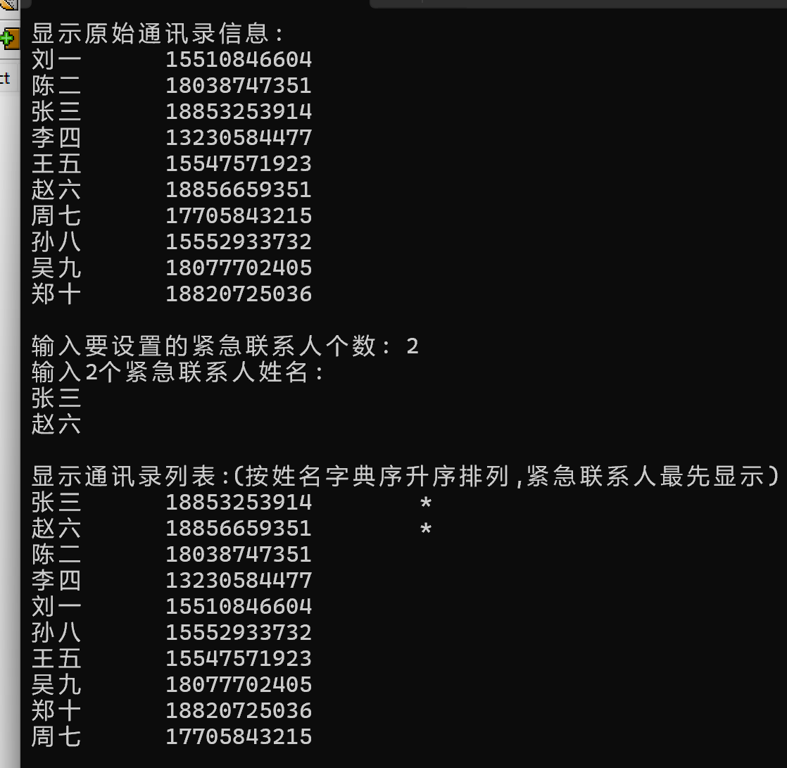 #include <stdio.h> #include <string.h> typedef struct { char name[20]; // 姓名 char phone[12]; // 手机号 int vip; // 是否为紧急联系人,是取1;否则取0 } Contact; // 函数声明 void set_vip_contact(Contact x[], int n, char name[]); // 设置紧急联系人 void output(Contact x[], int n); // 输出x中联系人信息 void display(Contact x[], int n); // 按联系人姓名字典序升序显示信息,紧急联系人最先显示 #define N 10 int main() { Contact list[N] = {{"刘一", "15510846604", 0}, {"陈二", "18038747351", 0}, {"张三", "18853253914", 0}, {"李四", "13230584477", 0}, {"王五", "15547571923", 0}, {"赵六", "18856659351", 0}, {"周七", "17705843215", 0}, {"孙八", "15552933732", 0}, {"吴九", "18077702405", 0}, {"郑十", "18820725036", 0}}; int vip_cnt, i; char name[20]; printf("显示原始通讯录信息: \n"); output(list, N); printf("\n输入要设置的紧急联系人个数: "); scanf("%d", &vip_cnt); printf("输入%d个紧急联系人姓名:\n", vip_cnt); for(i = 0; i < vip_cnt; ++i) { scanf("%s", name); set_vip_contact(list, N, name); } printf("\n显示通讯录列表:(按姓名字典序升序排列,紧急联系人最先显示)\n"); display(list, N); return 0; } // 将联系人数组x中,联系人姓名与name一样的人,设置为紧急联系人(即成员vip值设为1) void set_vip_contact(Contact x[], int n, char name[]) { int i; for(i=0;i<n;++i) { if(strcmp(x[i].name,name)==0) x[i].vip= 1; } } // 显示联系人数组x中的联系人信息 // 按姓名字典序升序显示, 紧急联系人显示在最前面 void display(Contact x[], int n) { int i,j=0; Contact s[N],t; for(i=0;i<n;++i) if(x[i].vip==1) { printf("%-10s%-15s", x[i].name, x[i].phone); printf("%5s", "*"); printf("\n"); } for(i=0;i<n;++i) if(x[i].vip!=1) s[j++]=x[i]; int cnt=j; //保存非VIP的个数 for(i=0;i<cnt;++i) for(j=0;j<cnt-1-i;++j) if(strcmp(s[j].name,s[j+1].name)>0) { t=s[j]; s[j]=s[j+1]; s[j+1]=t; } for(i = 0; i < cnt; ++i) { printf("%-10s%-15s", s[i].name, s[i].phone); printf("\n"); } printf("\0"); } void output(Contact x[], int n) { int i; for(i = 0; i < n; ++i) { printf("%-10s%-15s", x[i].name, x[i].phone); if(x[i].vip) printf("%5s", "*"); printf("\n"); } }