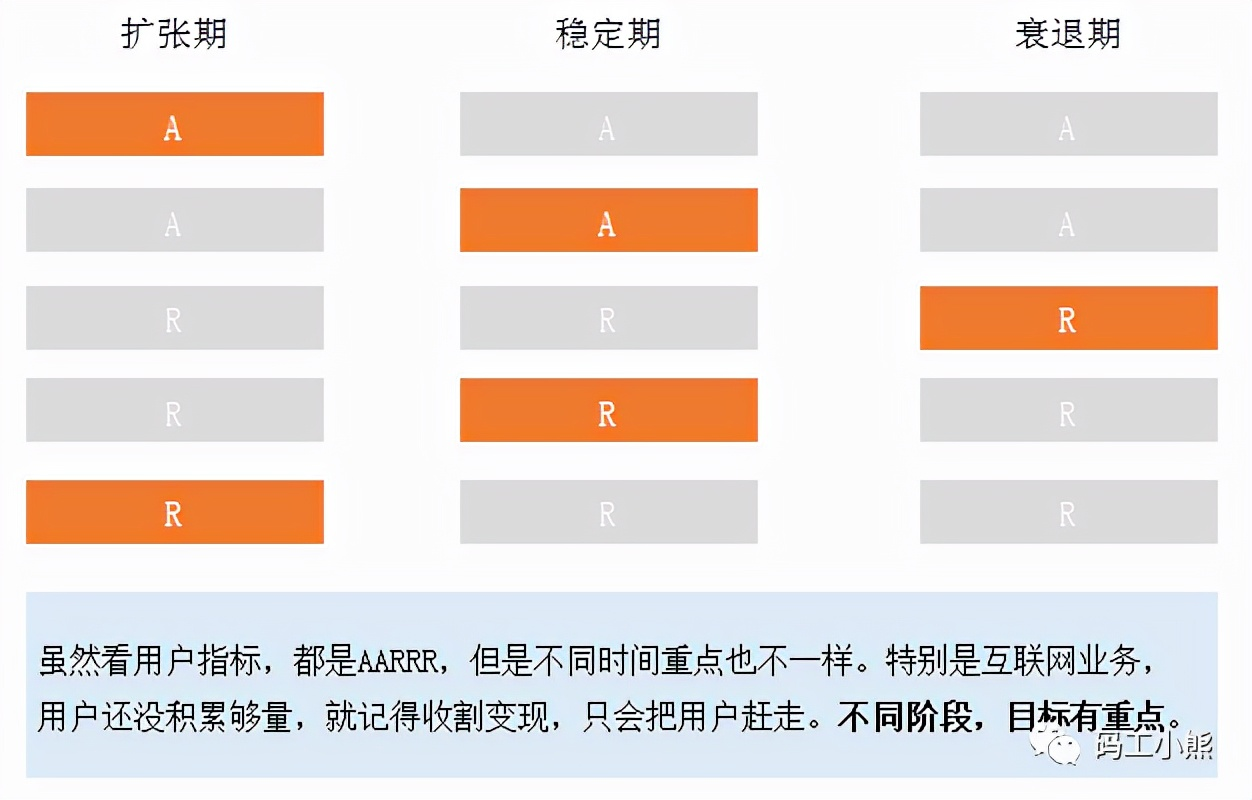 理论上,用AARRR模型也能识别节奏,上一篇文章分享过,在业务扩张期、稳定期、衰退期,需要关注的重点指标不同。通过监控业务渗透率,用户增长速度,用户流失速度,也能衡量出:业务目前在扩张、稳定还是衰退(如下图)。