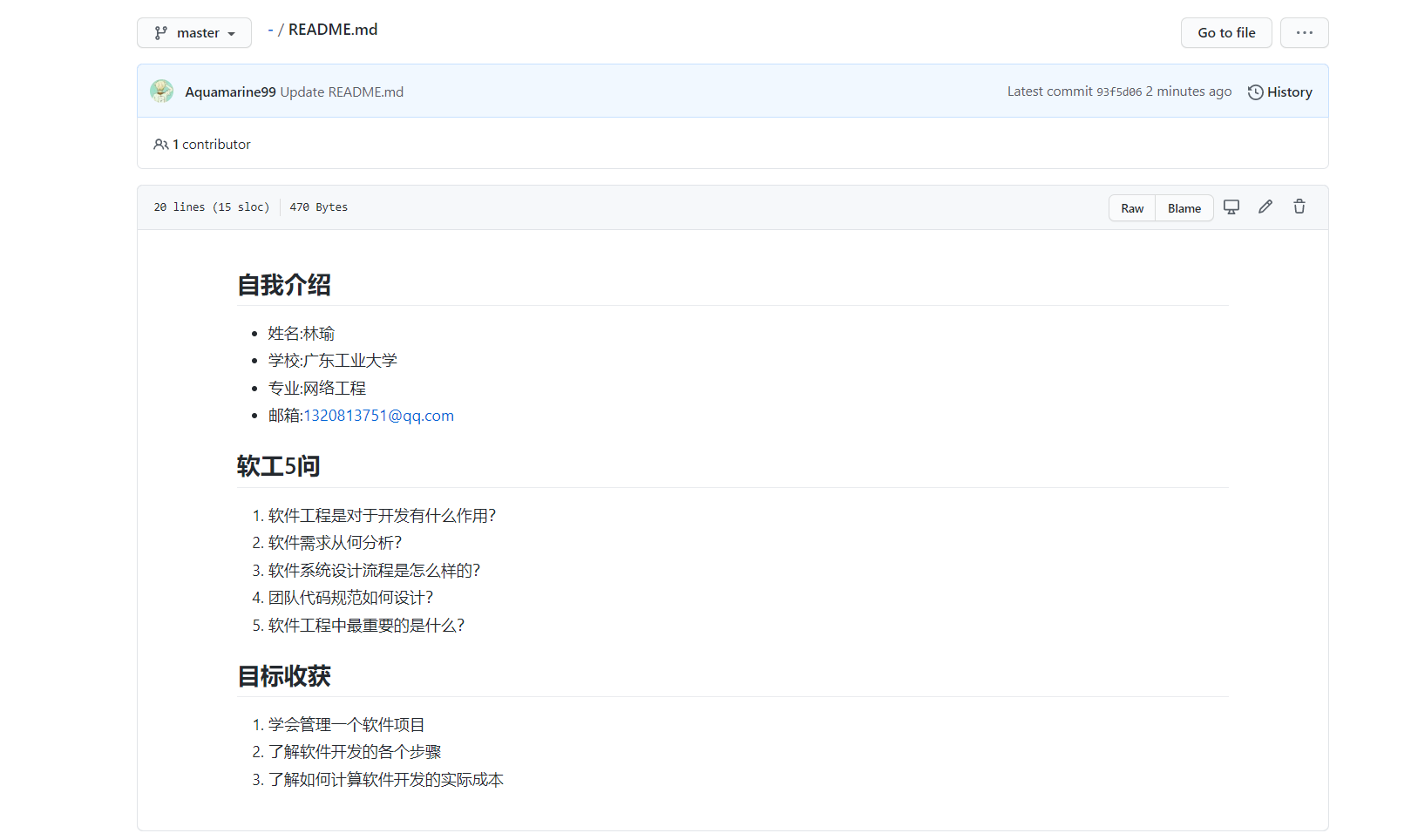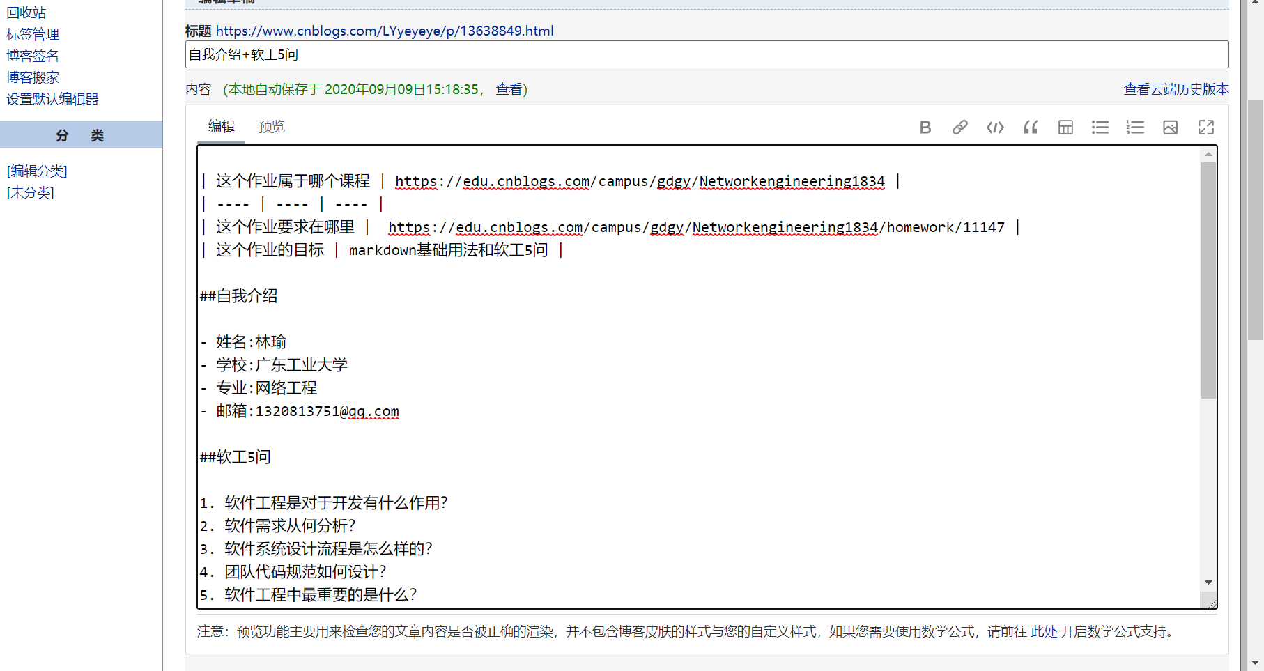 | 这个作业的目标 | markdown基础用法和软工5问 |
