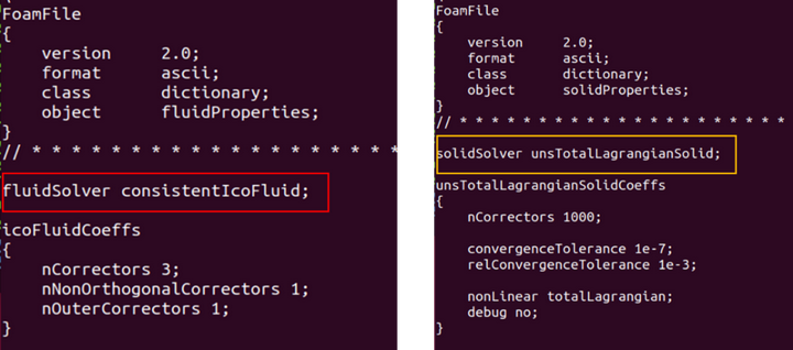 fluid/solid文件夹下的constant内新增了fluidProperties和solidProperties字典文件,用户可以在这两个字典文件中分别指定流体求解器和固体求解器,例如该算例选用了consistentIcoFluid作为流体求解器,unsTotalLagrangianSolid作为固体求解器(图 9)。