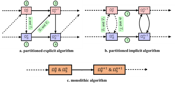 - 双向显式/隐式法采用分步计算法(Partitioned Method),如图 3所示,流体和固体由各自对应的求解器单独求解,然后通过界面进行信息交换,流体传递给固体压力和粘性力,固体反馈给流体形变和速度。显式计算法中的流体和固体在每个时间步长内只进行一次信息交换,而隐式计算法中的流体和固体在每个时间步长内进行多次交换迭代达到收敛。