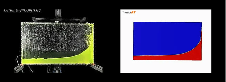 多相流分析软件TransAT从算法上对Level Set方法进行优化,通过质量重新初始化方法对质量守恒进行修正,在捕捉液舱晃荡具有明显自由表面的界面流方面,具有独特优势。