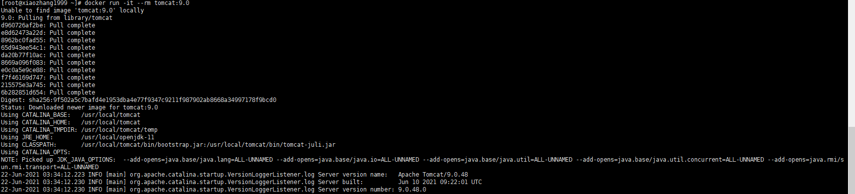 在官方文档中Tomcat的使用:docker run -it --rm tomcat:9.0