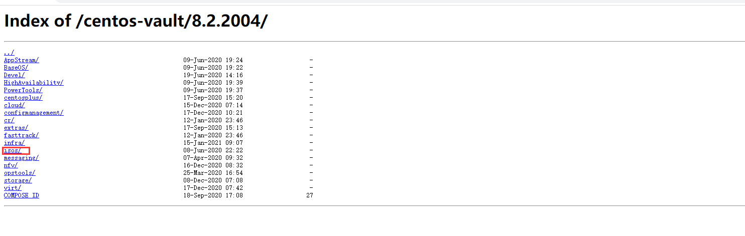 一般情况下我会下载CentOS-8.2.2004-x86_64-minimal,但是很多同学喜欢下载CentOS-8.2.2004-x86_64-dvd1。区别就在于前者是最小化的CentOS,后者提供了GUI(桌面)及其他环境,根据个人需求下载即可。