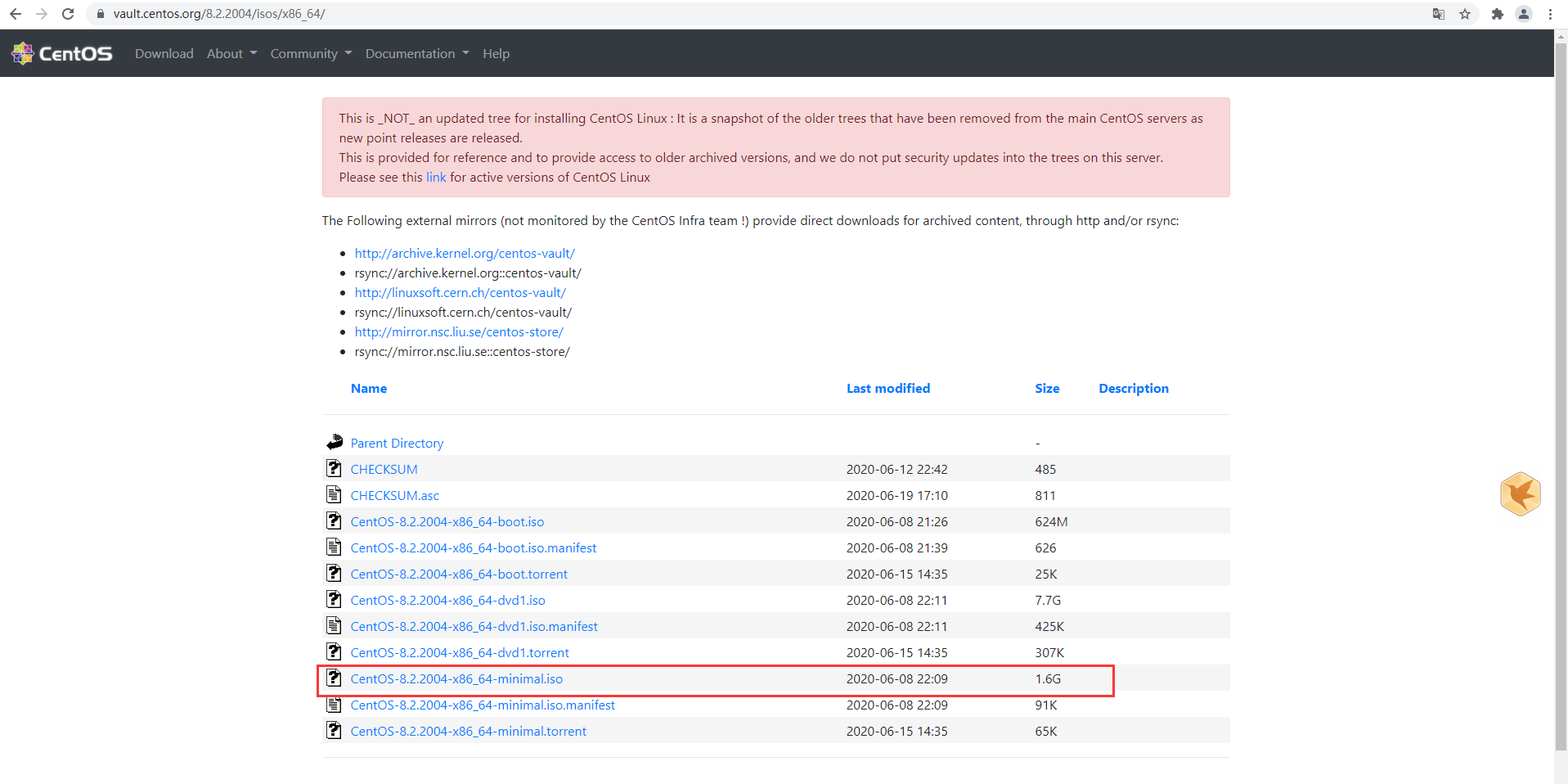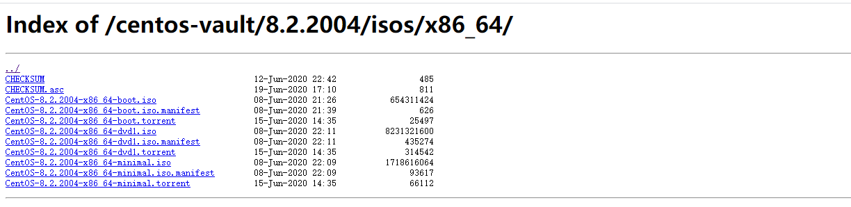 下面是最重要的文件选择、我们可以选择CentOS-8.2.2004-x86_64-minimal.iso这个文件直接下载源镜像。当然、为了节省时间我们还可以下载CentOS-8.2.2004-x86_64-minimal.torrent、这是一个种子文件。