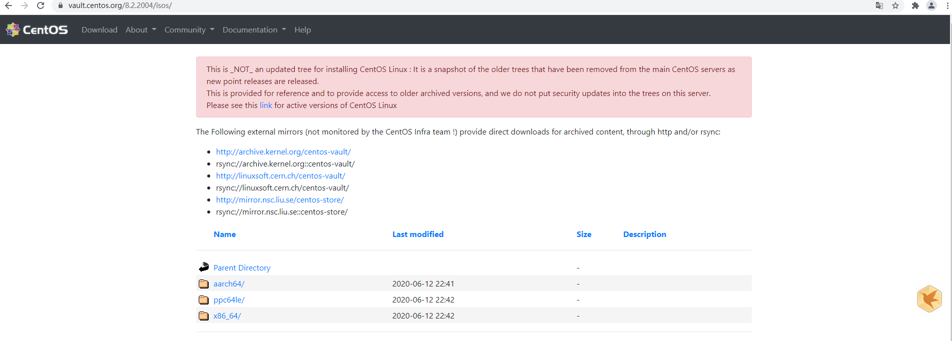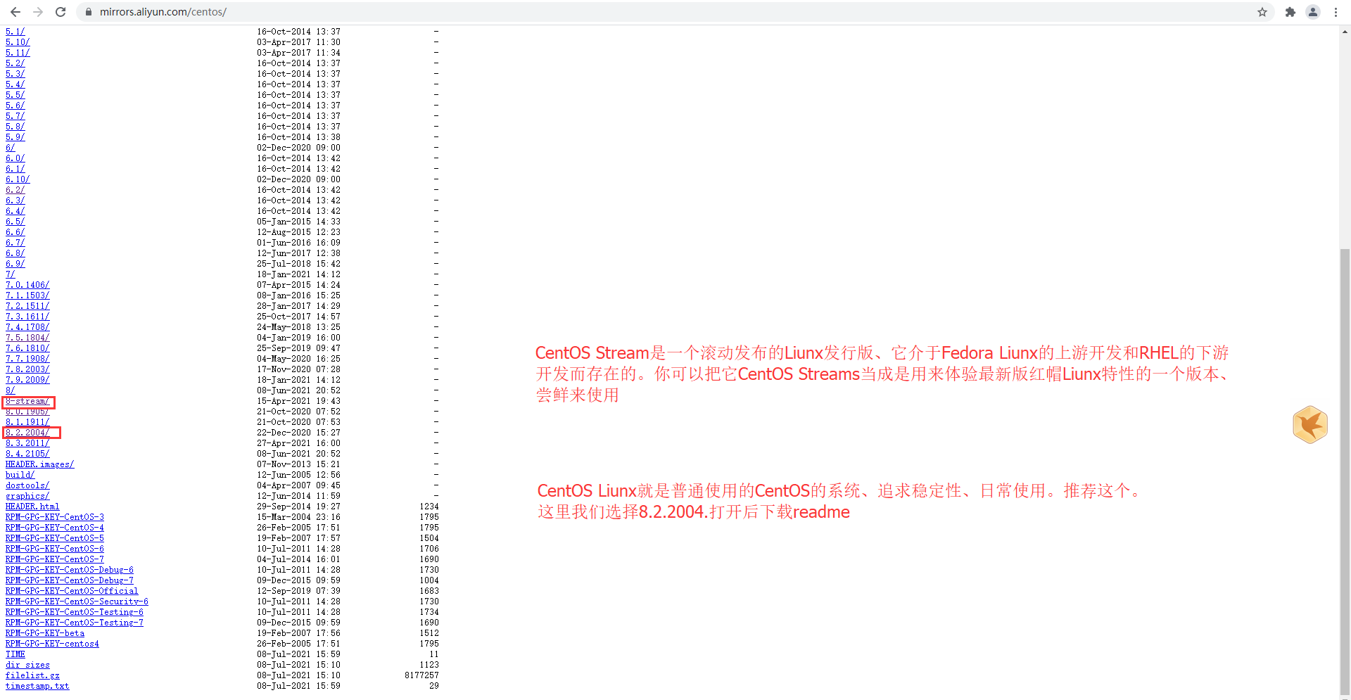 选择8.2.2004版本、下载readme后打开、截图的地址是CentOS官网地址、我们可以通过阿里云镜像站地址里面的其它版本下的readme信息找到这个网址、这里面包含了各个历史版本的镜像文件