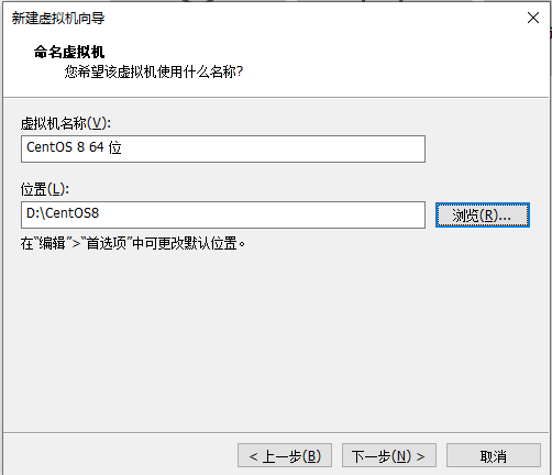 4.虚拟机名称输入CentOS8 64位、点击浏览更改系统的安装位置、我这里选择的是D:/CentOS8.建议和CentOS8 iso文件一起放在这目录下