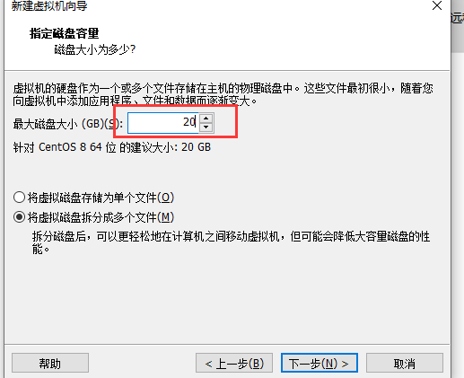 5.最大磁盘容量就默认最大磁盘文件为20G、点击下一步。