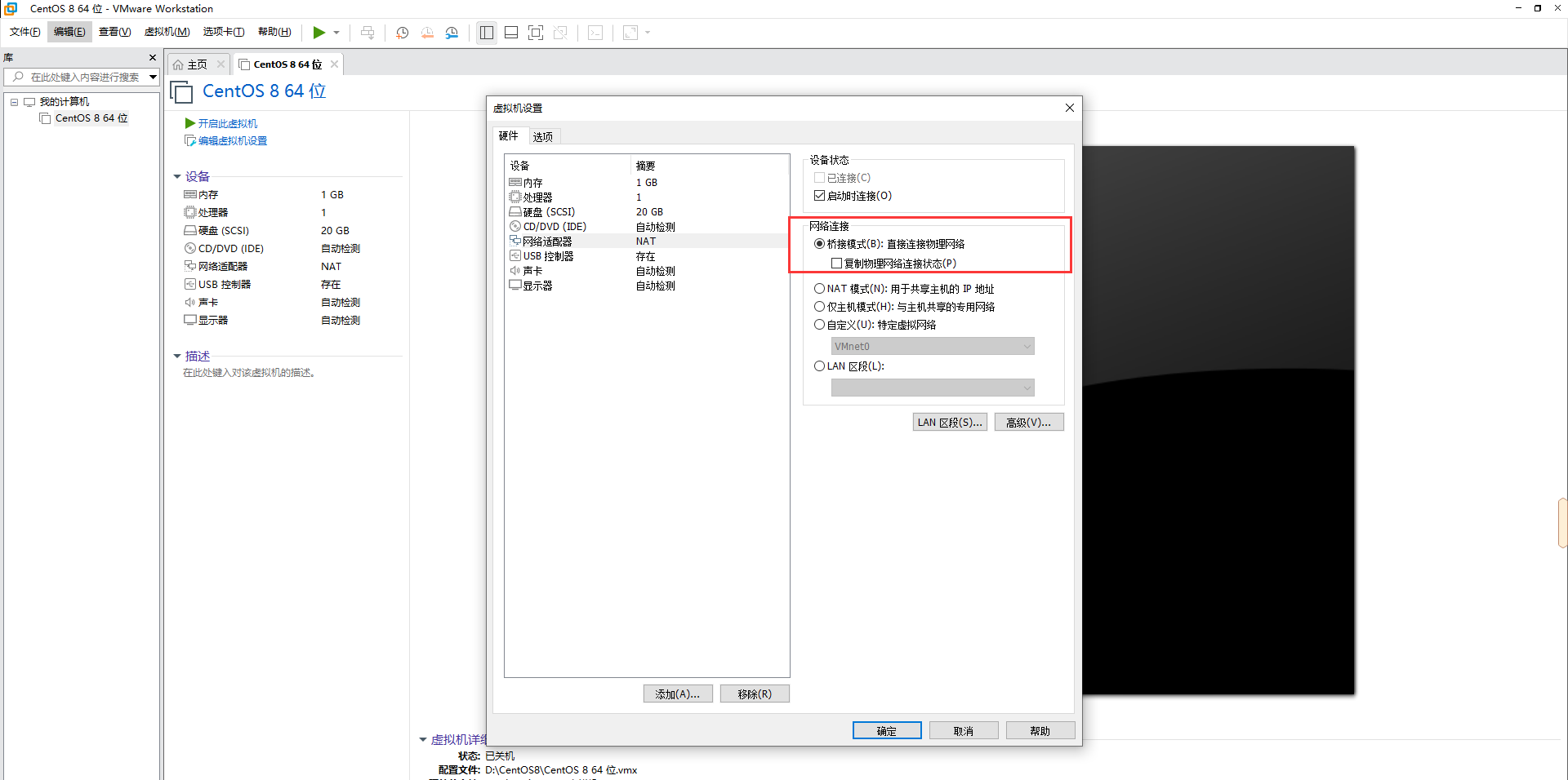 9.我这里选择的是桥接模式、桥接模式网络地址就是你本地计算机连接的网络地址。