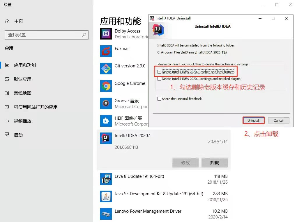 下载完成后正常安装、安装时电脑会提示里系统上已经存有一个旧版本的Idea、去控制面板直接卸载旧版本的Idea、什么都不用勾选直接删除;或者仅删除老版本的缓存和历史记录。而图中第二条删除配置和已安装插件不要勾选,不然新版本安装后无法读取原来配置和插件,点击uninstall,然后我们的旧版idea就会卸载。