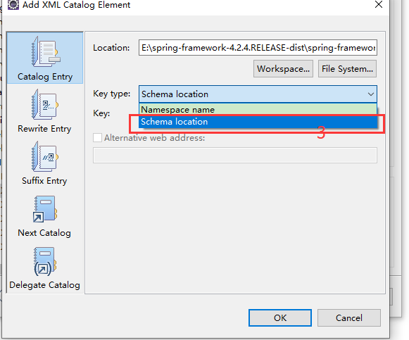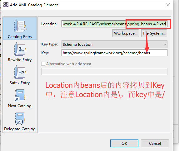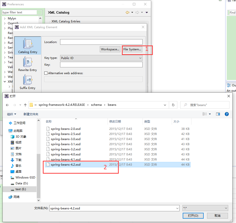 3.将之前复制的内容粘贴入URI框内,找到File输入框最右边…按钮,点击进入Choose Schema File界面找到本地对应的约束文件,这里为spring-beans-4.2.4xsd,点击确定就好啦