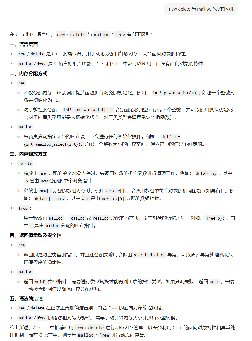 使用范围:new、delete是操作符,可以重载,只能在C++中使用;malloc、free是函数,C、C