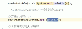 usePrinter(ps::printUpper); // 这里的printUpper就是跟上面的Lambda表达式的内容一样的,先转大写,再打印出来