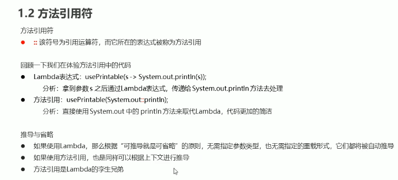 其实就是引用类中的成员方法,具体例子看黑马视频P370,讲一下大概,就是在Lambda表达式中定义了一个方法,但是这个方法在另一个类中已经有了对应的成员方法实现了相同的功能所以,我们可以在后续的代码中,引用那个类的成员方法。那么就需要先创建一个该类的对象,然后通过对象调用那个成员方法,eg:
