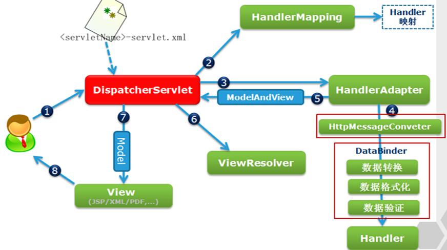 HandlerAdpater处理,将数据模型(Model)转发到View组件