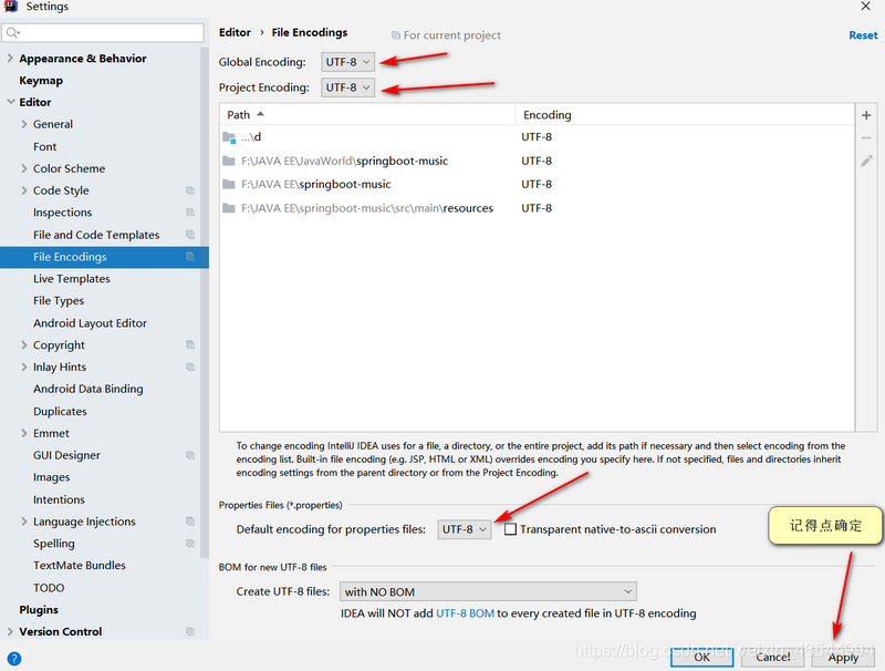 修改IDEA编辑器编码为utf8File->Settings->Editor->File Encodings,都改为UTF-8