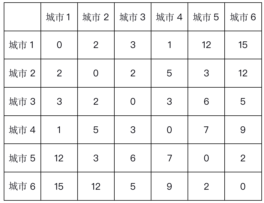 有 6 个城市,任何两个城市之间都有一条道路连接,6 个城市两两之间的距离如下表所示,则城市 1 到城市 6 的最短距离为____。