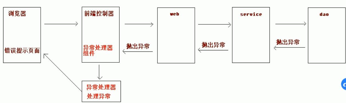 Controller调用Service,Service调用Dao,异常处理从下层往上层抛,最终有DispatcherServlet找异常处理器进行异常的处理。
