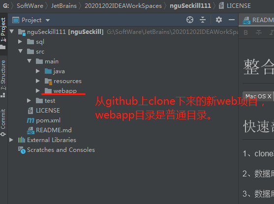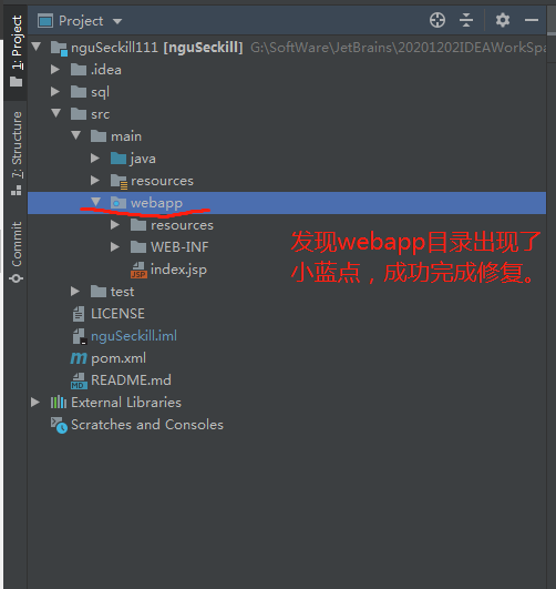 如果细心观察,可以发现 src->main->webapp 目录是一个普通目录,文件小图标上没有小蓝点。