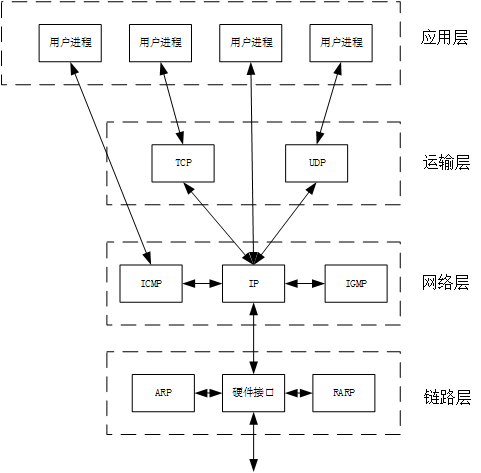 网络层:处理分组在网络中的活动,例如分组选路。包括IP,ICMP和IGMP