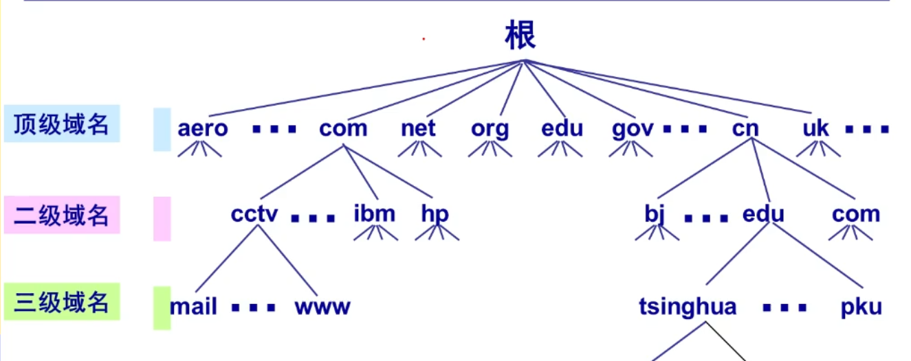 - 域名由多个标号序列组成,各个标号序列之间用符号 . 隔开: ... . 三级域名.二级域名.顶级域名;