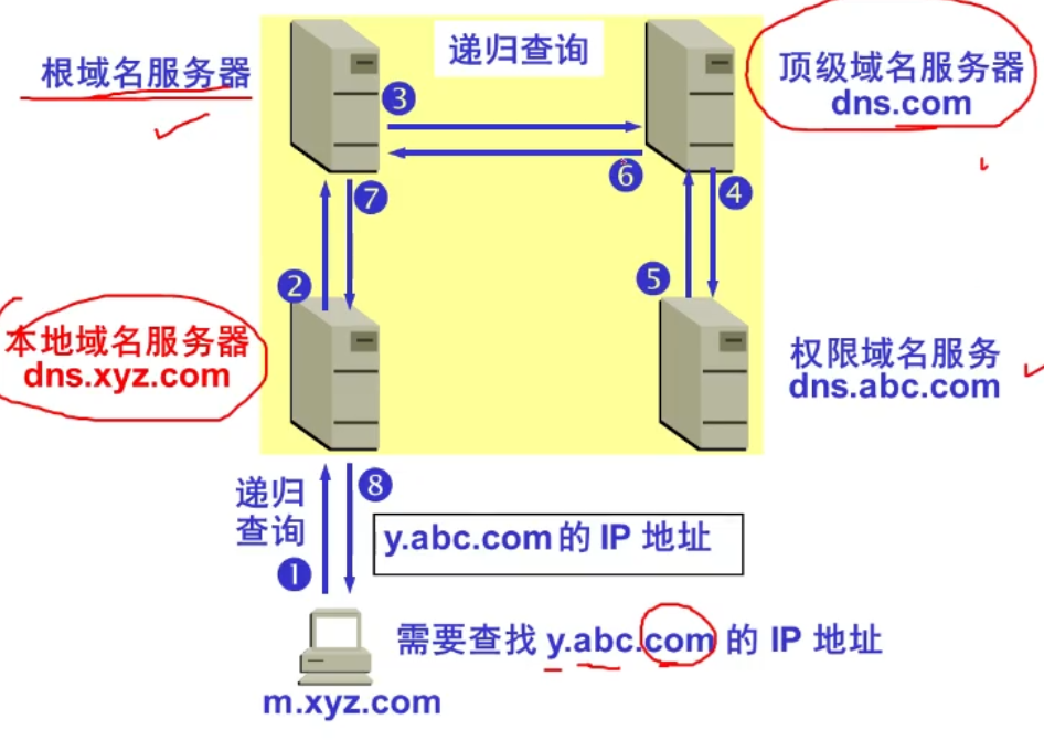 - 本地DNS服务器收到请求后,去缓存里找,如果找到对应的IP就返回给主机,主机进入6. ,否则进入5,.;