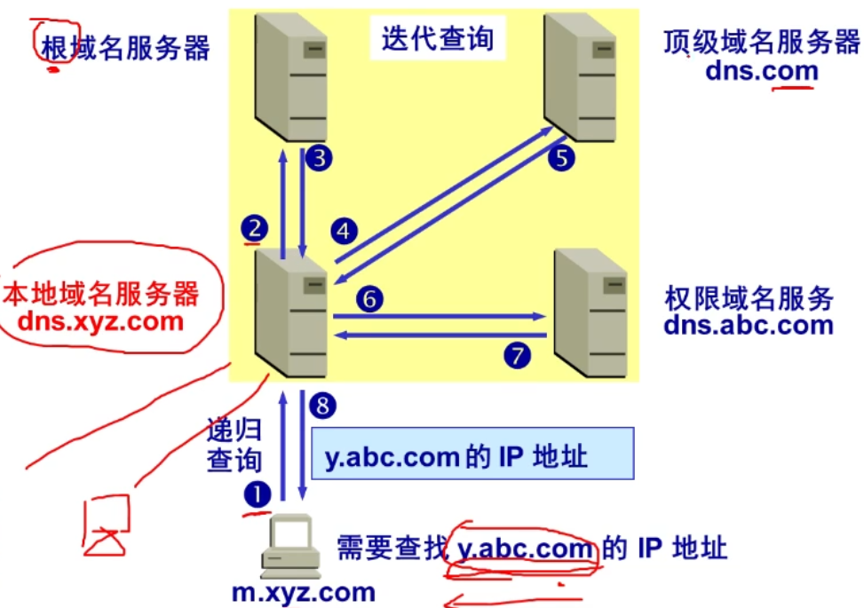 - 本地DNS服务器通过迭代方式找到IP,返回给主机;