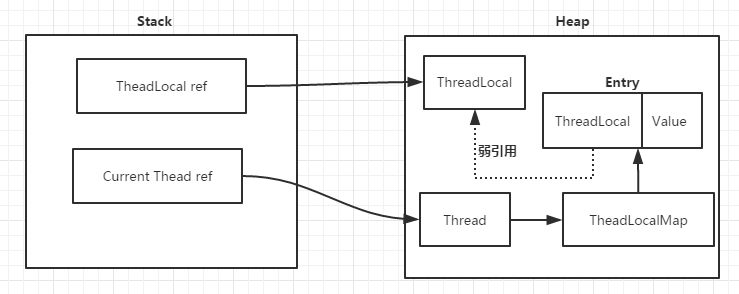 容器内部维护了一个Entry数组,每个Entry对象可以视为一个键值对(K,V),key就是ThreadLocal对象,value就是线程独享的变量,需要注意的是Entry对Tread Local对象封装了弱引用。当ThreadLocal对象的强引用指向Null后,进行垃圾回收时,ThreadLocal对象会被回收,因为弱引用不能阻止垃圾回收。