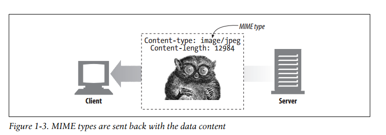 Web servers attach a MIME type to all HTTP object data (see Figure 1-3). When a web browser gets an object back from a server, it looks at the associated MIME type to see if it knows how to handle the object. Most browsers can handle hundreds of popular object types: displaying image files, parsing and formatting HTML files, playing audio files through the computer's speakers, or launching external plug-in software to handle special formats.
