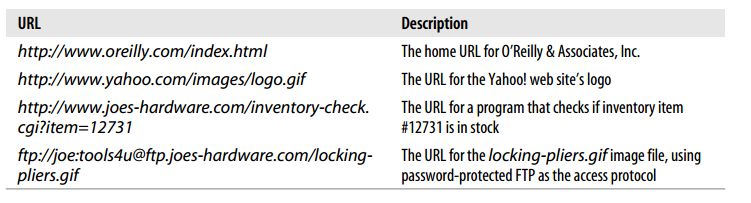 The uniform resource locator(URL) is the most common form of resource identifier. URLs describe the specific location of a resource on a particular server. They tell you exactly how to fetch a resource from a precise, fixed location. Figure 1-4 shows how a URL tells precisely where a resource is located and how to access it. Table 1-1 shows a few examples of URLs.