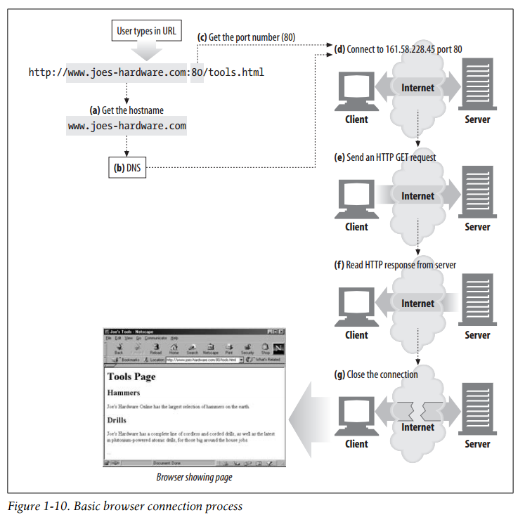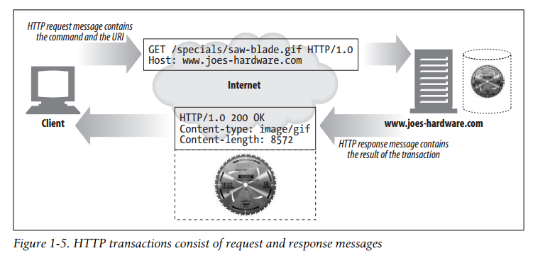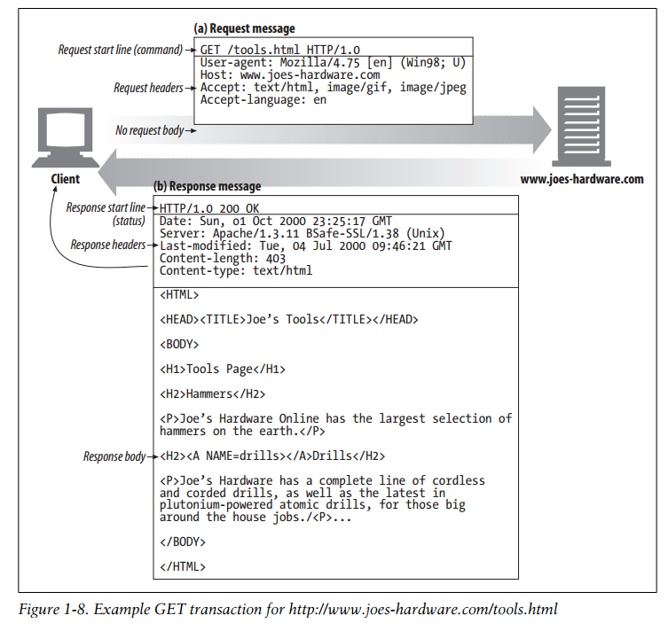 Figure 1-8 shows the HTTP messages that might be sent as part of a simple transaction. The browser requests the resource http://www.joes-hardware.com/tools.html.