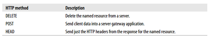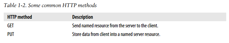 HTTP supports several different request commands, called HTTP methods. Every HTTP request message has a method. The method tells the server what action to perform (fetch a web page, run a gateway program, delete a file, etc.). Table 1-2 lists five common HTTP methods.