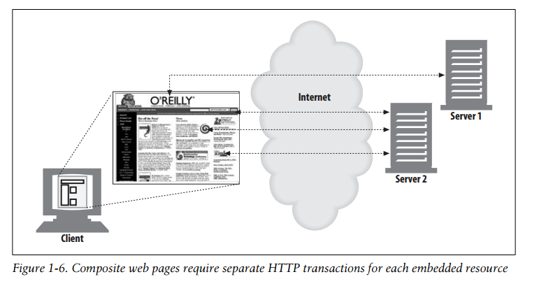 An application often issues multiple HTTP transactions to accomplish a task. For example, a web browser issues a cascade of HTTP transactions to fetch and display a graphics-rich web page. The browser performs one transaction to fetch the HTML "skeleton" that describes the page layout, then issues additional HTTP transactions for each embedded image, graphics pane, Java applet, etc. These embedded resources might even reside on different servers, as shown in Figure 1-6. Thus, a "web page" often is a collection of resources, not a single resource.