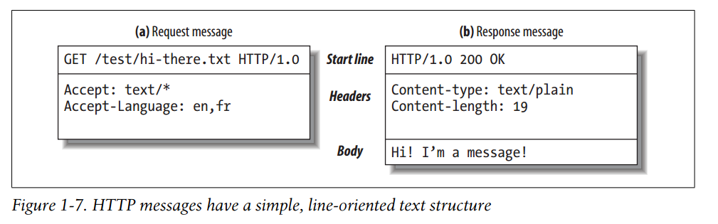 HTTP messages are simple, line-oriented sequences of characters. Because they are plain text, not binary, they are easy for humans to read and write. Figure 1-7 shows the HTTP messages for a simple transaction.