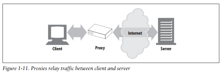 As shown in Figure 1-11, a proxy sits between a client and a server, receiving all of the client's HTTP requests and relaying the requests to the server (perhaps after modifying the requests). These applications act as a proxy for the user, accessing the server on the user's behalf.