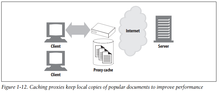A web cache or caching proxy is a special type of HTTP proxy server that keeps copies of popular documents that pass through the proxy. The next client requesting the same document can be served from the cache's personal copy (see Figure 1-12).