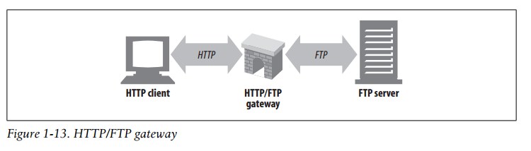 For example, an HTTP/FTP gateway receives requests for FTP URIs via HTTP requests but fetches the documents using the FTP protocol (see Figure 1-13). The resulting document is packed into an HTTP message and sent to the client. We discuss gateways in Chapter 8.