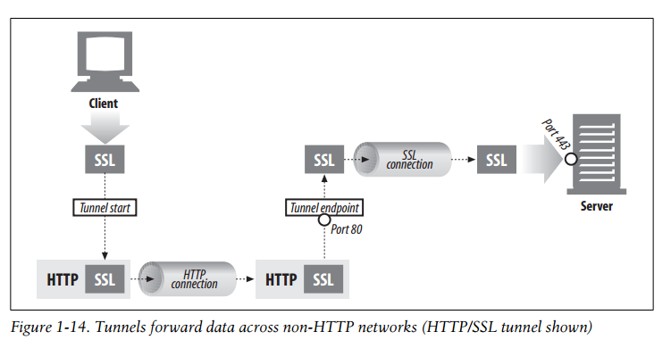 One popular use of HTTP tunnels is to carry encrypted Secure Sockets Layer (SSL) traffic through an HTTP connection, allowing SSL traffic through corporate firewalls that permit only web traffic. As sketched in Figure 1-14, an HTTP/SSL tunnel receives an HTTP request to establish an outgoing connection to a destination address and port, then proceeds to tunnel the encrypted SSL traffic over the HTTP channel so that it can be blindly relayed to the destination server.