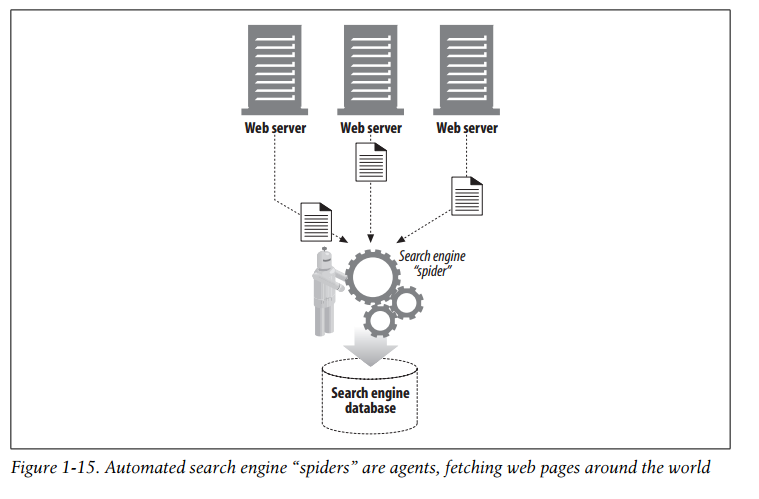 For example, there are machine-automated user agents that autonomously wander the Web, issuing HTTP transactions and fetching content, without human supervision. These automated agents often have colorful names, such as “spiders” or “web robots” (see Figure 1-15). Spiders wander the Web to build useful archives of web content, such as a search engine's database or a product catalog for a comparison shopping robot. See Chapter 9 for more information.