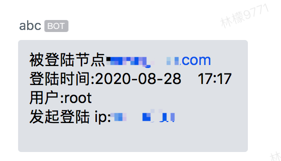 #!/bin/bash #登录用户 user=$USER #发起登陆ip ip=${SSH_CLIENT%% *} #时间 time=$(date +%F%t%k:%M) #服务器名 server=$HOSTNAME #判断如果登录者的IP地址不是指定的IP,则发邮件报警 if [ "$ip" != "12.123.12.12" ] && [ "$ip" != "12.34.12.24" ];then echo -e "被登陆节点:$server \n登陆时间:$time \n用户:$user \n发起登陆 ip:$ip \n" > /tmp/msg #也可以发邮件 # echo -e "time:$time \nuser:$user \nlogin ip:$ip \n"|mail -s "server:$server" xiaoming@qq.com #调用给机器人推消息的脚本 python2.7 /tmp/sent_ssh.py > /dev/null 2>&1 fi