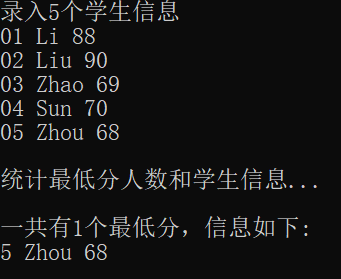 #include <stdio.h> const int N=5; // 定义结构体类型struct student,并定义STU为其别名 typedef struct student { long no; char name[20]; int score; }STU; // 函数声明 void input(STU s[], int n); int findMinlist(STU s[], STU t[], int n); void output(STU s[], int n); int main() { STU stu[N], minlist[N]; int count; printf("录入%d个学生信息\n", N); input(stu, N); printf("\n统计最低分人数和学生信息...\n"); count = findMinlist(stu, minlist, N); printf("\n一共有%d个最低分,信息如下:\n", count); output(minlist, count); return 0; } // 输入n个学生信息,存放在结构体数组s中 void input(STU s[], int n) { int i; for(i=0; i<n; i++) scanf("%ld %s %d", &s[i].no, s[i].name, &s[i].score); } // 输出结构体s中n个元素信息 void output(STU s[], int n) { int i; for(i=0; i<n; i++) printf("%ld %s %d\n", s[i].no, s[i].name, s[i].score); } // 在结构体数组s中,查找最低分学生的记录,将其存入结构体数组s中 // 形参n是结构体数组s中元素个数 // 函数返回最低分的学生人数 int findMinlist(STU s[], STU t[], int n) { int i,min=s[0].score; int j; for(i=0;i<n;i++){ if (min>s[i].score) min=s[i].score; } i=0; for(j=0;j<n;j++){ if(s[j].score==min) t[i++]=s[j]; } return i; }