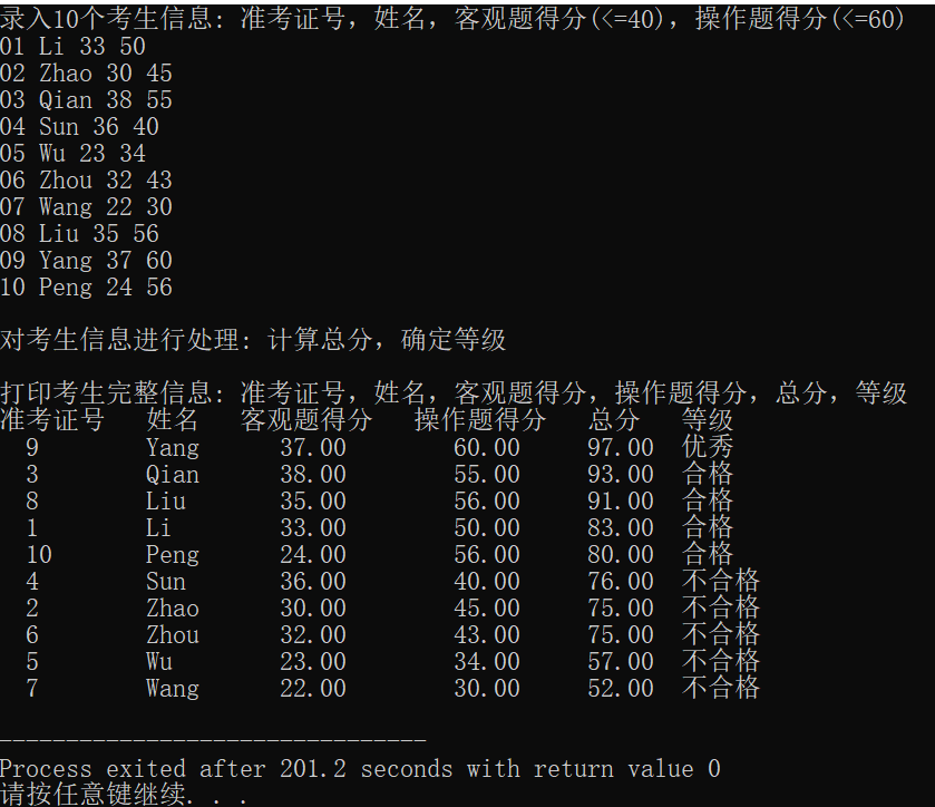 #include <stdio.h> #include <string.h> const int N = 10; // 定义结构体类型struct student,并定义其别名为STU typedef struct student { long int id; char name[20]; float objective; /*客观题得分*/ float subjective; /*操作题得分*/ float sum; char level[10]; }STU; // 函数声明 void input(STU s[], int n); void output(STU s[], int n); void process(STU s[], int n); int main() { STU stu[N]; printf("录入%d个考生信息: 准考证号,姓名,客观题得分(<=40),操作题得分(<=60)\n", N); input(stu, N); printf("\n对考生信息进行处理: 计算总分,确定等级\n"); process(stu, N); printf("\n打印考生完整信息: 准考证号,姓名,客观题得分,操作题得分,总分,等级\n"); output(stu, N); return 0; } // 录入考生信息:准考证号,姓名,客观题得分,操作题得分 void input(STU s[], int n) { int i; for(i=0;i<n;i++) scanf("%ld%s%f%f",&s[i].id,s[i].name,&s[i].objective,&s[i].subjective); } //输出考生完整信息: 准考证号,姓名,客观题得分,操作题得分,总分,等级 void output(STU s[], int n) { int i; printf("准考证号 姓名 客观题得分 操作题得分 总分 等级\n"); for(i=0;i<n;i++) printf(" %-9ld%-10s%-13.2f%-10.2f%-7.2f%-8s\n", s[i].id,s[i].name,s[i].objective,s[i].subjective,s[i].sum,s[i].level); } // 对考生信息进行处理:计算总分,排序,确定等级 void process(STU s[], int n) { int i,j,k; int s1,s2; s1=(int)(N*0.1),s2=(int)(N*0.5); STU temp; for(i=0;i<n;i++) s[i].sum=s[i].objective+s[i].subjective; for(j=0;j<n-1;j++) for(k=0;k<n-j-1;k++) if(s[k].sum<s[k+1].sum) { temp=s[k]; s[k]=s[k+1]; s[k+1]=temp; } for(i=0;i<s1;i++) strcpy(s[i].level,"优秀"); for(i=s1;i<s2;i++) strcpy(s[i].level,"合格"); for(i=s2;i<n;i++) strcpy(s[i].level,"不合格"); }