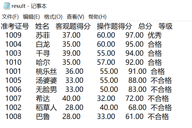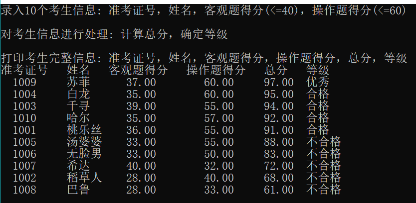 #include <stdio.h> #include <string.h> const int N = 10; // 定义结构体类型struct student,并定义其别名为STU typedef struct student { long int id; char name[20]; float objective; /*客观题得分*/ float subjective; /*操作题得分*/ float sum; char level[10]; }STU; // 函数声明 void input(STU s[], int n); void output(STU s[], int n); void process(STU s[], int n); int main() { STU stu[N]; printf("录入%d个考生信息: 准考证号,姓名,客观题得分(<=40),操作题得分(<=60)\n", N); input(stu, N); printf("\n对考生信息进行处理: 计算总分,确定等级\n"); process(stu, N); printf("\n打印考生完整信息: 准考证号,姓名,客观题得分,操作题得分,总分,等级\n"); output(stu, N); return 0; } // 从文本文件examinee.txt读入考生信息:准考证号,姓名,客观题得分,操作题得分 void input(STU s[], int n) { FILE *fp; fp = fopen("examinee.txt", "r");//以只读方式打开examinee.txt if( !fp ) { printf("fail to open examinee.txt\n"); // 如果打开失败,则输出错误提示信息,然后退出程序 } int i; for(i=0;i<n;i++) // 从fp指定的文件中格式化读取一个学生信息 { if(fscanf(fp,"%ld %s %f %f",&s[i].id,s[i].name,&s[i].objective,&s[i].subjective)==0) printf("fail to read~"); // 如果读取失败,则输出错误提示信息,然后退出程序 } fclose(fp); } // 输出考生完整信息: 准考证号,姓名,客观题得分,操作题得分,总分,等级 // 不仅输出到屏幕上,还写到文本文件result.txt中 void output(STU s[], int n) { int i; FILE *fout; fout=fopen("result.txt","w");// 以只写文本方式打开文本文件result.txt printf("准考证号 姓名 客观题得分 操作题得分 总分 等级\n");//打印表头 fprintf(fout,"准考证号 姓名 客观题得分 操作题得分 总分 等级\n"); for(i=0;i<n;i++)// 格式化输出学生信息到fout指定的文件中 { printf(" %-9ld%-10s%-13.2f%-10.2f%-7.2f%-8s\n", s[i].id,s[i].name,s[i].objective,s[i].subjective,s[i].sum,s[i].level); fprintf(fout," %-9ld %-10s%-13.2f%-10.2f%-7.2f%-8s\n", s[i].id,s[i].name,s[i].objective,s[i].subjective,s[i].sum,s[i].level); } fclose(fout); } // 对考生信息进行处理:计算总分,排序,确定等级 void process(STU s[], int n) { int i,j,k; int a1,a2; a1=(int)(N*0.1),a2=(int)(N*0.5); STU temp; for(i=0;i<n;i++) s[i].sum=s[i].objective+s[i].subjective; for(j=0;j<n-1;j++) for(k=0;k<n-j-1;k++) if(s[k].sum<s[k+1].sum) { temp=s[k]; s[k]=s[k+1]; s[k+1]=temp; } for(i=0;i<a1;i++) strcpy(s[i].level,"优秀"); for(i=a1;i<a2;i++) strcpy(s[i].level,"合格"); for(i=a2;i<n;i++) strcpy(s[i].level,"不合格"); }